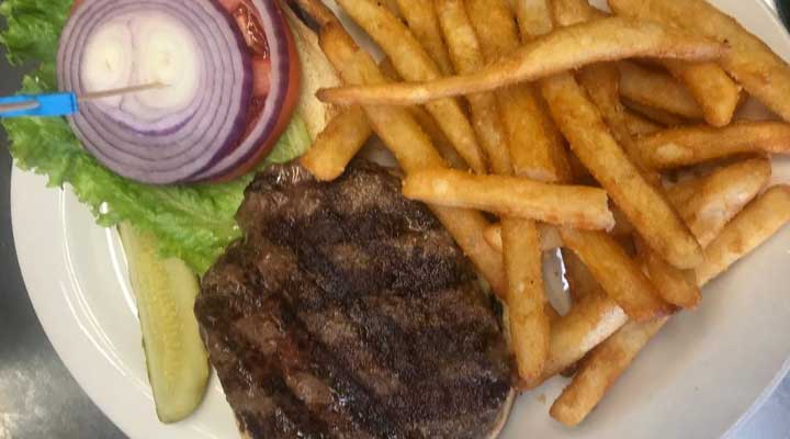 1/2 pound of seasoned lean ground beef grilled to order. Served with lettuce, tomato and red onion.
